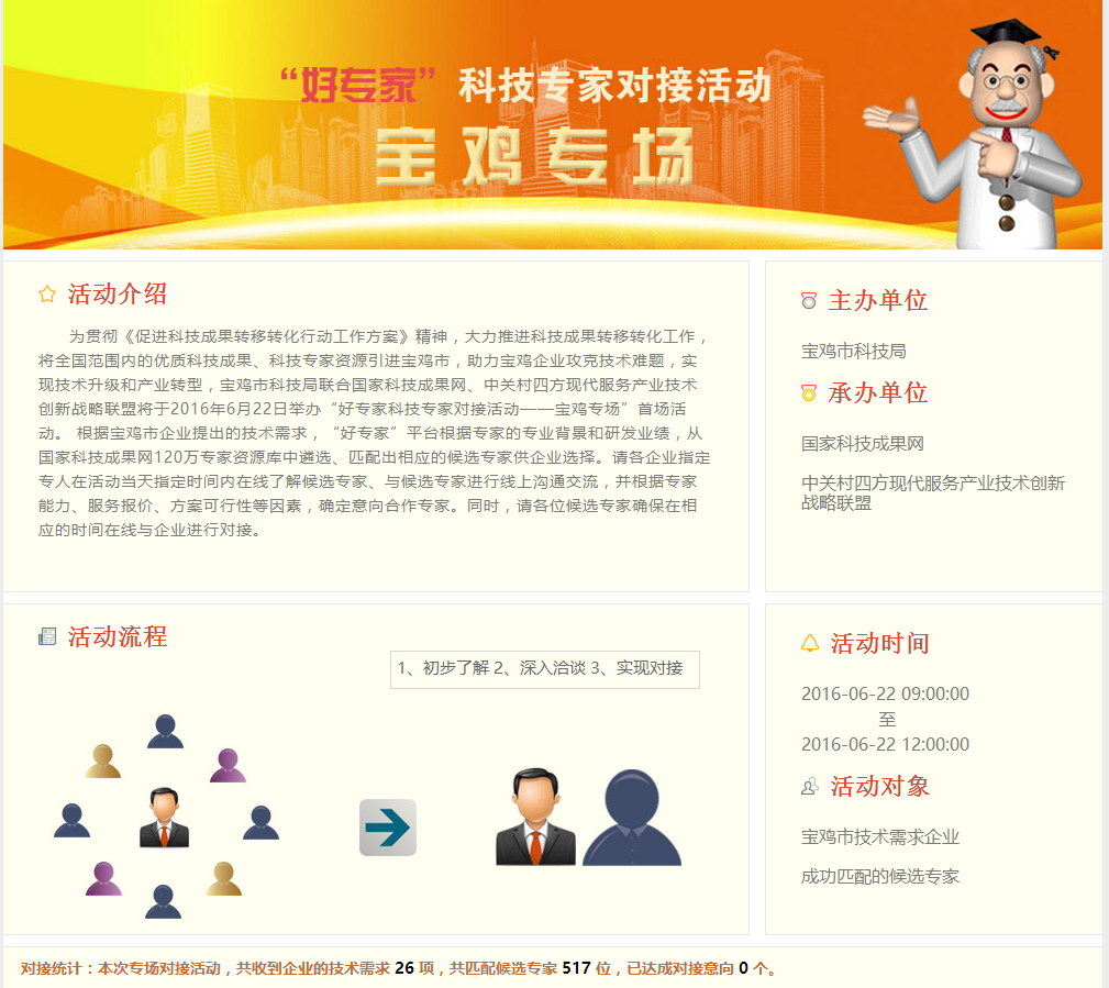 为贯彻《促进科技成果转移转化行动工作方案》精神,大力推进科技成果转移转化工作,将全国范围内的优质科技成果、科技专家资源引进宝鸡市,助力宝鸡企业攻克技术难题,实现技术升级和产业转型,宝鸡市科技局联合国家科技成果网、中关村四方现代服务产业技术创新战略联盟将于2016年6月22日举办“好专家科技专家对接活动——宝鸡专场”首场活动。
