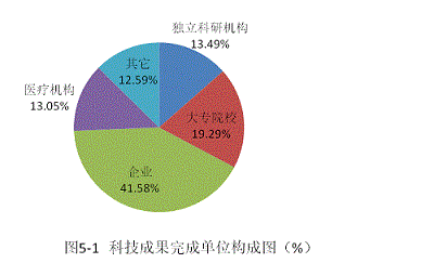对各类型成果完成单位的应用技术成果所属行业进行统计,不同属性的单位侧重的行业各有不同。独立科研机构侧重于农、林、牧、渔业(46.44%)和科学研究及技术服务业(19.8%);大专院校侧重于农、林、牧、渔业(19.71%),卫生和社会工作(17.95%),制造业(16.0%),科学研究及技术服务业(14.54%);企业侧重于制造业(44.88%),电力、热力、燃气及水的生产和供应业(9.57%),农、林、牧、渔业(9.53%);医疗机构侧重于卫生和社会工作(97.95%)(见表5-2)。