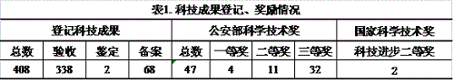 2014年度我部共登记科技成果408项,其中,应用技术成果288项,与2013年同比增长33%;软科学成果117项,与2013年同比增长185%;基础理论成果3项。我部评出公安部科学技术奖47项,其中,一等奖4项,二等奖11项,三等奖32项;荣获国家科学技术进步奖2项。见表1。