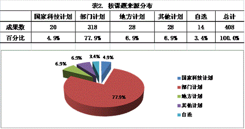 在408项登记成果中,来源于国家科技计划项目的成果占4.9%,部门计划项目成果占77.9%,地方计划项目成果占6.9%,其他计划项目成果占6.9%,自选项目成果占3.4%。因要求公安部各类科研计划项目及公安部组织申报的各类国家科研计划项目验收后的成果必须登记,其他成果自愿登记,故部门计划项目成果占主要部分。见表2。