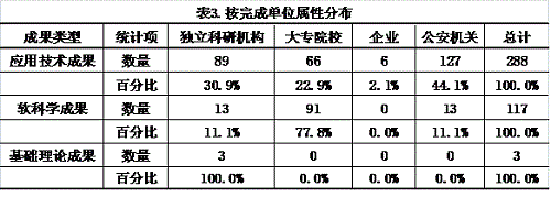 在应用技术成果中,公安机关成果127项,占44.1%,表明近半数应用技术科技成果由公安机关自己完成。在软科学成果中,大专院校成果91项,占77.8%,表明大专院校为软科学成果主要研究力量;基础理论研究成果有3项,由独立科研机构完成。见表3。
