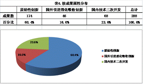 在应用技术成果中,“原始性创新”成果占成果总数的60.4%,“国外引进消化吸收创新”成果占16.0%,“国内二次开发”占23.6%。见表4。