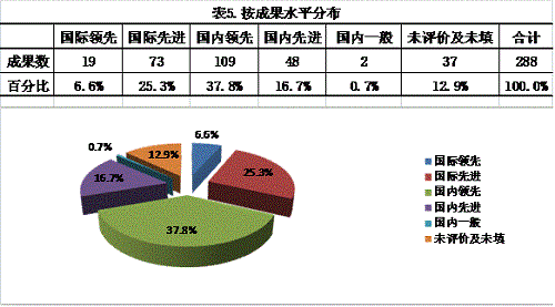 在应用技术成果中,“国际领先”占6.6%,“国际先进”占25.3%,“国内领先”占37.8%,“国内先进”占16.7%。见表5。