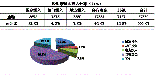 2014年度登记成果的经费实际投入额总计37829万元,其中国家投入8693万元,占23.0%,部门投入1575万元,占4.2%,地方投入2880万元,占7.6%,自有资金17534万元,占46.4%,其他投入7147万元,占18.9%。见表6。