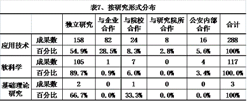 从研究形式看,应用技术成果以独立研究和与企业合作为主,其中,独立研究成果占54.9%,与企业合作成果占28.5%,与院校合作成果占8.3%,与研究院所合作成果占2.8%,公安内部合作成果占5.6%;软科学成果以独立研究为主,其中,独立研究成果占89.7%,与企业合作成果占0.9%,与院校合作成果占6.0%,公安内部合作成果占3.4%。见表7。