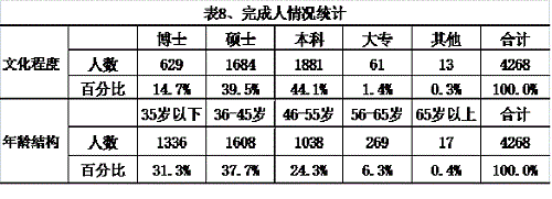 登记成果共涉及完成人4268人,按文化程度和年龄结构分布情况见表8。