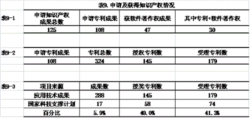 在288项应用技术类成果中共有125项申请了知识产权,申请专利成果共108项,申请并获得软件著作权成果共47项,其中有30项成果同时申请了专利和软件著作权,见表9-1。在108项申请专利成果中,共获得授权专利145项,已受理专利179项,见表9-2。2014年授权专利数和受理专利数比2013年度有较大幅度增长,分别同比增长230%、108%。在17项国家科技支撑计划项目成果中,获授权专利58项,占授权专利总数40.0%;已受理专利74项,占总受理专利41.3%,见表9-3。