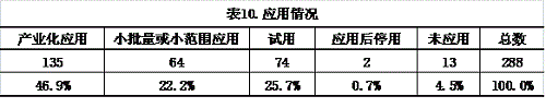 在288项应用技术类成果中,产业化应用成果135项,占成果总数的46.9%;小批量或小范围应用成果64项,占22.2%;试用成果74项,占25.7%;停用和未应用成果15项,占5.2%。见表10。