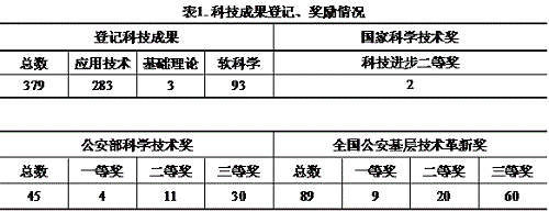2015年度,我部共完成科技成果登记379项,获国家科学技术进步奖2项,评出公安部科学技术奖45项,评出全国公安基层技术革新奖89项(见表1)。