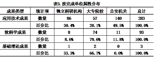在283项应用技术成果中,第一完成单位为公安机关的成果140项,占49.5%,表明近半数应用技术科技成果由公安机关为主完成。在93项软科学成果中,第一完成单位为大专院校的成果74项,占79.6%,表明大专院校为软科学成果主要研究力量;基础理论研究成果仅有3项。(见表3)