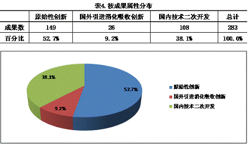 在283项应用技术成果中,“原始性创新”成果占成果总数的52.7%,“国外引进消化吸收创新”成果占9.2%,“国内二次开发”占38.1%。(见表4)