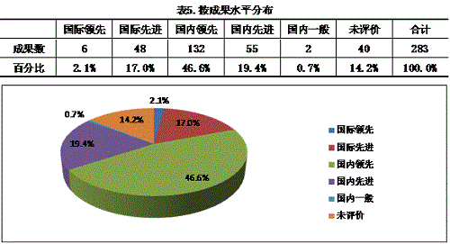 在283项应用技术成果中,“国际领先”占2.1%,“国际先进”占17.0%,“国内领先”占46.6%,“国内先进”占19.4%。(见表5)
