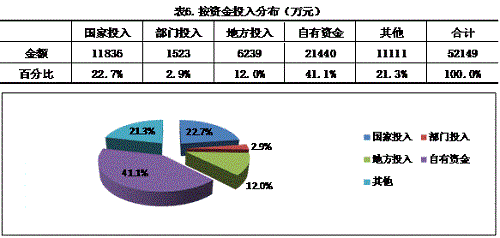 2015年度登记成果的经费实际投入额总计52149万元。其中,国家投入11836万元,占22.7%;部门投入1523万元,占2.9%;地方投入6239万元,占12%;自有资金21440万元,占41.1%;其他投入11111万元,占21.3%。(见表6)