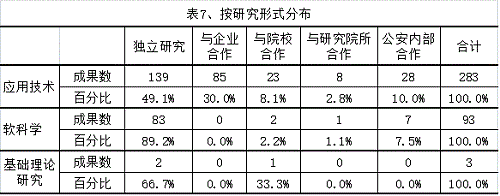 从研究形式看,应用技术成果以独立研究和与企业合作为主,其中,独立研究成果占49.1%,与企业合作成果占30.0%;软科学成果以独立研究为主,独立研究成果占89.2%。(见表7)