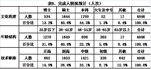 登记成果共涉及完成人4046人,按文化程度、年龄结构和技术职称分布情况见表8。