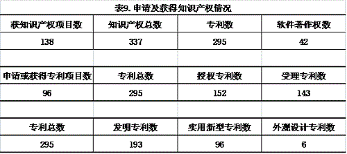 在283项应用技术类成果中,共有138项申请了知识产权,申请知识产权数量共337项,其中,专利295项,软件著作权42项。在295项专利中,授权专利152项,受理专利143项;发明专利193项,实用新型专利96项,外观设计专利6项。(见表9)