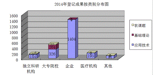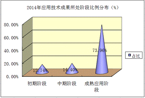 据统计,2014年登记的2166项应用类科技成果中,处于实验室、小试等初期阶段的312项,比去年增加了13.04%;处于制备样机、试样等中期阶段的299项,比去年减少了4.17%;处于大规模、大范围并已产生经济效益的成熟应用阶段的1555项,比去年减少了2.93%。