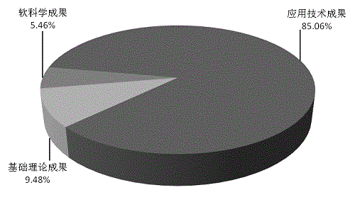 登记的科技成果仍以应用技术类为主。在696项登记科技成果中,应用技术类成果为592项,占85.06%;基础理论成果66项,占9.48%;软科学成果38项,占5.46%(见图2)。