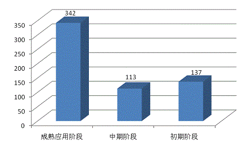 处于成熟应用阶段的成果为342项,占登记的应用技术成果总量的57.77%;处于中期阶段和初期阶段的应用技术成果分别为113项和137项,分别占19.09%和23.14%(见图7)。