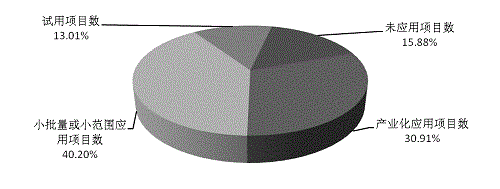 2014年度登记的592项应用技术科技成果中,产业化应用的数量达到183项,小批量或小范围应用项目的数量为238项,试用项目77项,未应用项目数为94项(见图8)。