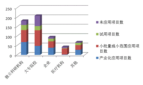 完成单位中,企业和独立科研机构以产业化应用的科技成果为主,分别占各自应用科技成果数的40.43%和37.57%。大专院校和医疗机构以小批量或小范围应用项目为主,分别占各自应用成果数的39.90%和76.19%(见图9)。