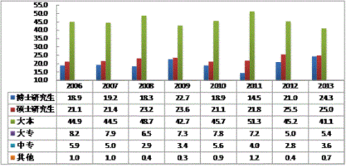 图1-7 2006~2013年科技成果完成人员学历结构(%)