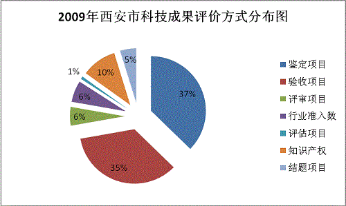 数据显示,2009年度成果评价方式表现为:鉴定为主,验收为主,评审为辅,其它评价方式并存。其中:鉴定项目数47项;验收项目数44项;评审项目数7项;行业准入数8项;评估项目数项1项;知识产权数13项。