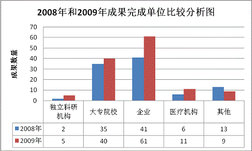 2009年度登记科研成果126项,按第一完成单位属性归为五大类,各类及所占比例为:独立科研机构:5项;大专院校:40项;企业:61项;医疗机构:11项;其他:9项。