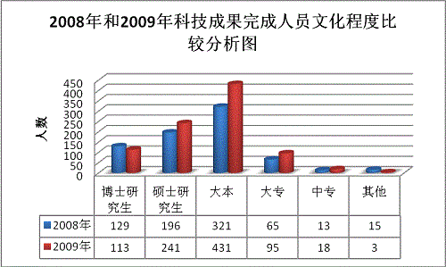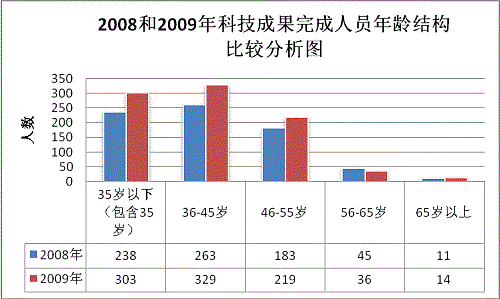 2009年度登记的科技成果完成人员与08年相比 ,虽然高层博士研究生有所减少,但是中高层人员学历与往年相比有明显提高,年龄层次也比08年趋于年轻化。