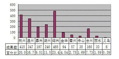 表 3-1浙江省2009年各地市科技局成果来源分布(%)