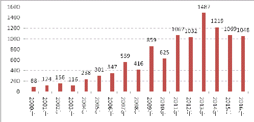 图1 2000-2016年质检科技成果登记数量统计