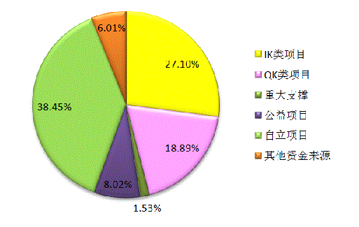 2016年,登记的1048项质检科技成果中,国家重大科技支撑项目16项,占全年总数1.53%;质检总局科技计划项目(IK类)284项,占全年总数27.10%;质检总局科技计划项目(QK类)198项,占全年总数18.89%;质检公益性行业科研专项84项,占全年总数8.02%;各地质检两局和四大院自立项目403项,占全年总数38.45%;其他资金来源项目63项,占全年总数6.01%。因此,2016年质检科技成果主要登记来源是质检总局科技计划项目、各地质检两局和四大院自立项目,合计885项,占全年总数84.44%。