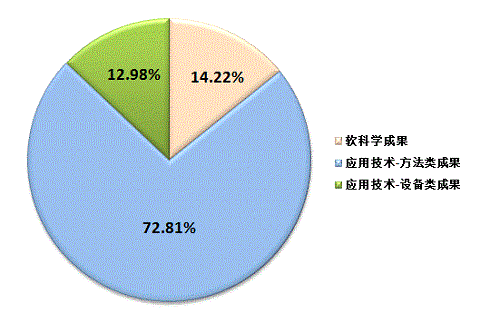2016年,登记的1048项质检科技成果中,软科学成果149项,占全年总数14.22%;应用技术成果899项,占全年总数85.78%。因此,应用技术成果是质检科技成果的主要类别。在应用技术成果中,应用技术-方法类成果763项,占全年总数72.81%;应用技术-设备类成果136项,占全年总数12.98%。
