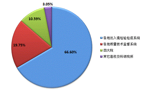 2016年,在质检总局进行科技成果登记的单位组成为:质检总局及直属挂靠单位、国家认监委、国家标准委、各地质检两局及所属事业单位、部分高校及科研院所。登记的1048项质检科技成果中,各地出入境检验检疫系统登记成果698项,占全年总数66.60%;各地质量技术监督系统登记成果207项,占全年总数19.75%;中国计量院、中国特检院(含特种设备科技协作平台)、中国标准院、中国检科院登记成果111项,占全年总数10.59%;其它单位登记数量为32项,占全年总数3.05%。