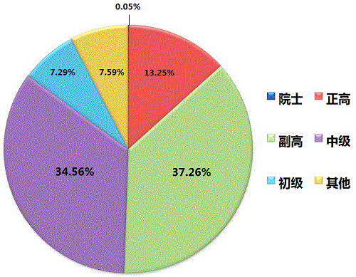 在登记人员中,院士5人次,占全部人员0.05%;正高级职称1040人次,占全部人员13.25%;副高职称2923人次,占全部人员37.26%;中级职称2712人次,占全部人员的34.56%;初级职称572人次,占全部人员7.29的%;其他人员596人次,占全部人员的7.59%。从职称构成上看,副高人员是质检科研的中坚力量。