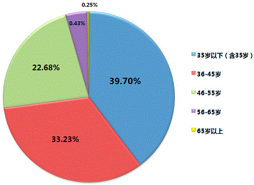 在登记人员中,35岁以下(含35岁)人员总计3116人次,占人员总数的39.70%;36-45岁人员总计2608人次,占人员总数33.23%;46-55岁总计1780人次,占人员总数22.68%;56-65岁总计325人次,占人员总数4.13%;65岁以上人员总计19人次,占人员总数0.25%。从年龄结构上看,35岁以下(含35岁)人员,是质检科研的中坚力量。