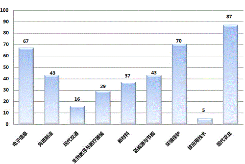 从成果所属技术领域来看,电子信息领域成果67项,先进制造领域成果43项,现代交通领域成果16项,生物医药与医疗器械领域成果29项,新材料领域成果37项,新能源与节能领域成果43项,环境保护领域成果70项,核应用技术领域成果5项,现代农业领域成果87项。