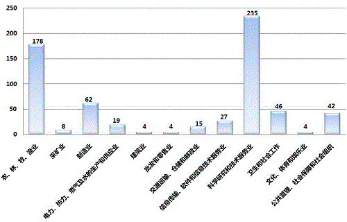从成果应用行业来看,农、林、牧、渔业行业成果178项,采矿业行业成果8项,制造业行业成果62项,电力、热力、燃气及水的生产和供应业行业成果19项,建筑业行业成果4项,批发和零售业行业成果4项,交通运输、仓储和邮政业行业成果15项,信息传输、软件和信息技术服务业行业成果27项,科学研究和技术服务业行业成果235项,卫生和社会工作行业成果46项,文化、体育和娱乐业行业成果4项,公共管理、社会保障和社会组织行业成果42项。