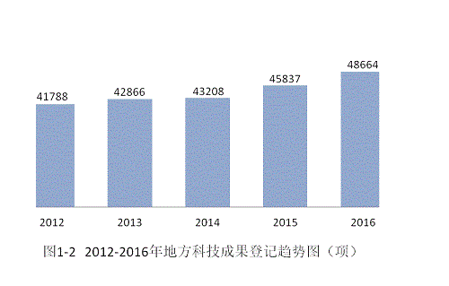 从近五年的情况来看,地方登记的科技成果总量呈现逐年增长的趋势,从2012年的41788项增加到2016年的48664项,增长16.45%(见图1-2)。