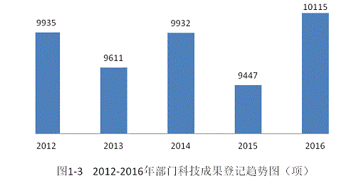 从近五年的情况来看,每年部门登记的科技成果总量在9400至11000项之间,呈波动状态。2016年部门登记科技成果总量高于前四年,为10115项,比上年多登记668项科技成果(见图1-3)。