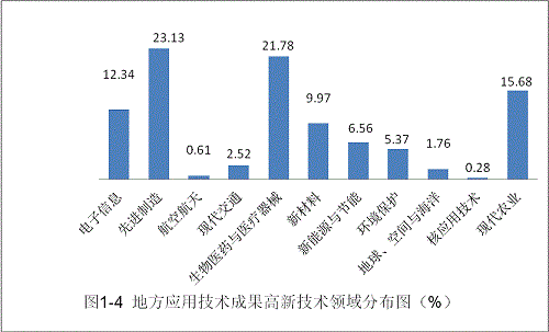 从主要经济地带看,东北地区的高新技术成果主要集中在生物医药与医疗器械以及现代农业领域,分别占该地区全部高新技术成果的31.67%和25.48%;环渤海地区的高新技术成果在生物医药与医疗器械领域最为集中,占该地区全部高新技术成果的34.11%,此外,先进制造、现代农业和电子信息领域成果相对略多,分别占到14.21%、11.78%和11.26%;长三角地区偏重先进制造(28.14%)、生物医药与医疗器械(17.27%)领域;珠三角地区偏重电子信息(28.53%)、生物医药与医疗器械(21.99%)领域(详见附表9)。