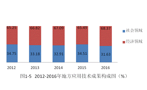 2016年地方应用技术成果在社会领域和经济领域的分布比例分别为31.63%、68.37%,社会领域的分布比例与上年相比略有降低。2012年以来,地方应用技术成果基本上是三分之一分布在社会领域,三分之二分布在经济领域(见图1-5)。