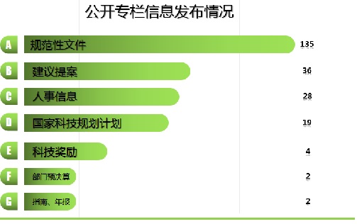 2.公开专栏发布情况。政府信息公开专栏完成了《科技部政府信息公开指南》修订并发布,《2016年科技部政府信息公开工作年度报告》及时上网,科技部2017年度部门预算、2016年度部门决算均上网公布,共主动发布信息226条。其中,规范性文件135条,占比59.73%;人大建议和政协提案复文36条,占比15.93%;国家科技规划计划19条,占比8.41%。