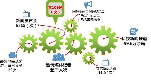 4.新闻发布会公开情况。科技部共举办新闻发布和专题宣传活动106场(次),其中参加“两会”记者会、十九大集体采访、国务院政策例行吹风会各1次,举办新闻发布会62场(次),部领导接受采访、或刊发署名文章25次、其他新闻发布活动16场(次),邀请媒体记者超过千人次。涉及科技部的科技新闻报道高达99.6万余篇(条),为社会公众深入了解科技工作提供了便捷渠道,为科技改革与创新提供了有力的舆论支撑。