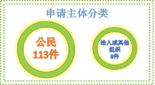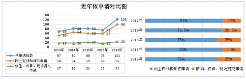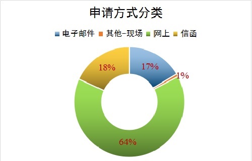 1.申请情况。2017年共收到依申请121件,超2016年50%,创历年新高。按申请主体分类,公民依然是申请主力,申请113件,占93.39%,法人和其他组织申请8件,占6.61%。按申请方式分类,占比最大的是网上在线系统,申请78件,占64%;信函和电子邮件占比相当,信函申请22件,占比18%;电子邮件申请20件,占比17%;另还有现场申请1件。按涉及业务分析,主要包括项目情况、政策文件、统计数据等,涉及科技部13个业务司局、事业单位。其中受公众关注程度最高的三项分别是项目全过程管理相关情况、政策文件落实情况和各类经费数据统计情况。