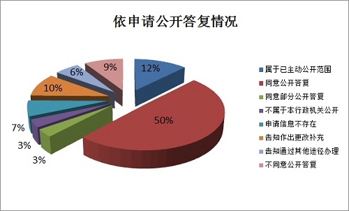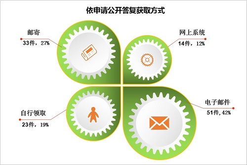2.答复情况。121件依申请已全部按规定办结。按照答复内容分类,“已主动公开”的15件,占12%;“同意公开”的60件,占50%;“同意部分公开”的4件,占3%;“不同意公开”的11件,占9%;“不属于本行政机关公开”的4件,占3%;“申请信息不存在”的8件,占7%;“告知作出更改补充”的12件,占10%;“告知通过其他途径办理”的7件,占6%。按答复获取方式分类,电子邮件答复51件,邮寄答复33件,网上系统答复14件,上门自取23件。