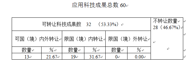 对有转让意向科技成果的分析。60项应用类科技成果中不转让的成果为28项(占应用类成果的46.67%);有转让意向的成果为32项(占应用类成果的53.33%),其中:可国(境)内外转让13项;限国(境)内转让19
