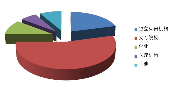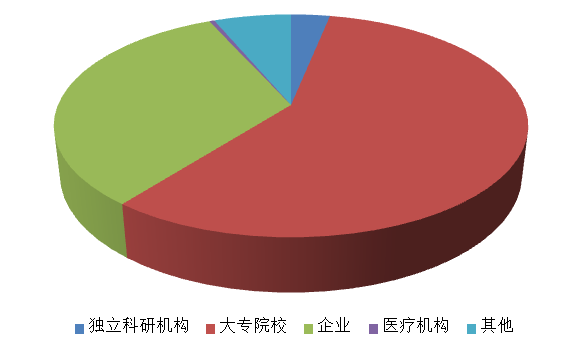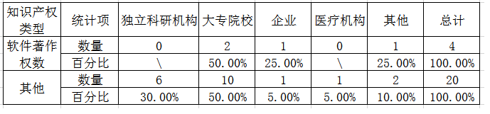 2018年,登记项目中拥有知识产权项目为24项。其中,软件著作权数为4项,占项目总数的16.67%;其他为20项,占项目总数的83.33%。已授权专利数为15项。从获得知识产权项目的承担单位性质来看,大多数为独立科研机构和大专院校,分别为6个和12个,占总数的25%和50%;企业为2个、医疗机构为1个、其他为3个。知识产权项目分布见图3。