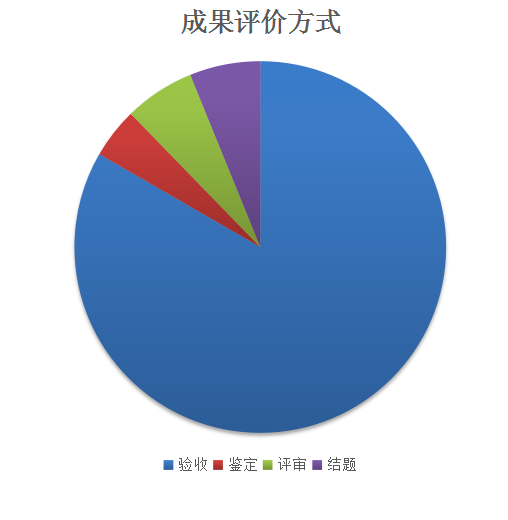 现阶段,我部科技成果评价方式大部分是验收。2018年登记项目中科技成果验收项目数为95项,鉴定、评审和结题项目数分别是5项、7项和7项,分别占项目总数的83.33%、4.39%、6.14%和6.14%。成果评价方式见图2。