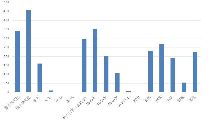 2018年,登记项目中涉及到的完成人员共966人。其中,文化程度方面,博士研究生为339人,硕士研究生为455人,本科为160人,大专为10人,其他为2人,分别占人员总数的35.09%、47.10%、16.56%、1.04%、0.21%;年龄结构方面,呈现老中青合理分布的状态,35岁以下为296人,36-45岁为354人,46-55岁为201人,56-65岁为108人,65岁以上为7人,分别占人员总数的30.64%、36.65%、20.81%、11.18%、0.72%;技术职称方面,有院士职称的为1人,正高职称的为231人,副高职称的为267人,中级职称的为191人,初级职称的为53人,其他为223人,分别占人员总数的0.1%、23.91%、27.64%、19.77%、5.49%、23.08%。具体情况见图6。